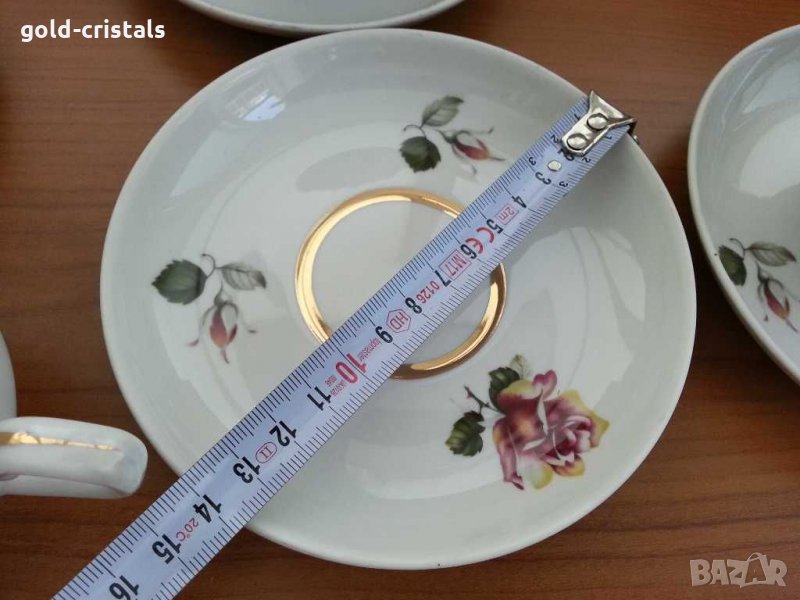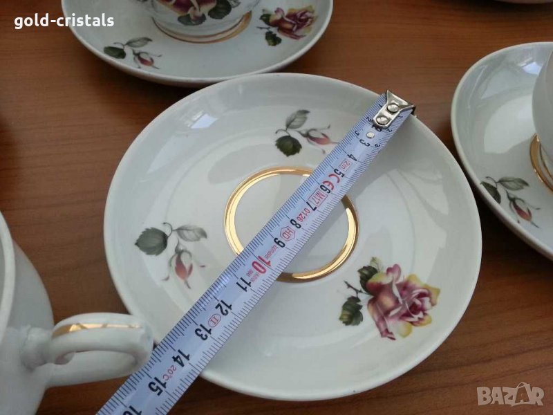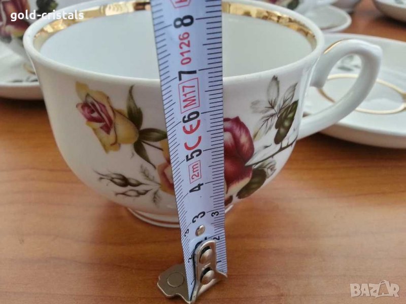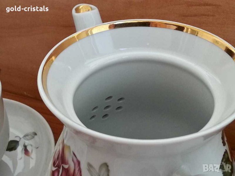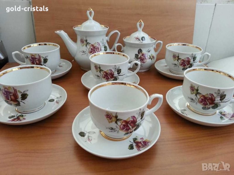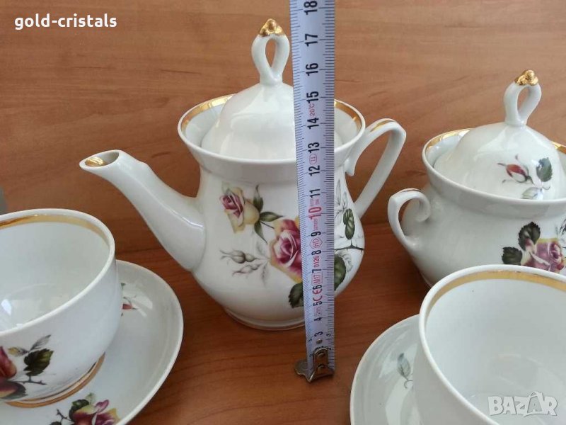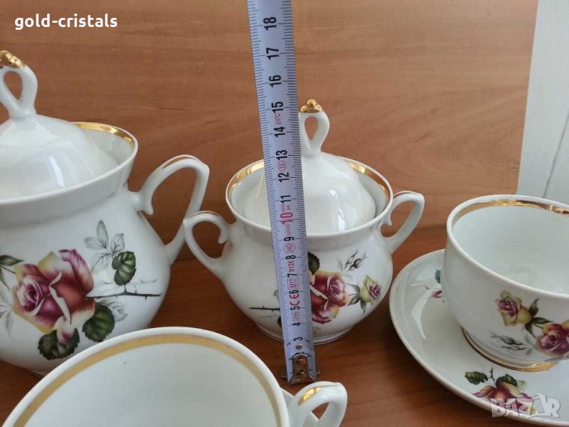 Руски порцеланов сервиз за чай кафе маркиран съветски ссср 6бр чаши 6бр чинии чайник с капаче захарница с капаче неизползвани комплект сет лот ретро арт декор винтидж колекция стари старинни антикварни предмети обзавеждане за дома и семейството подходящи за подарък за ценители и колекционери