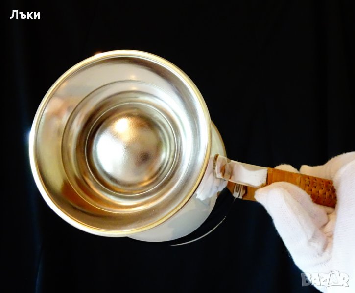 изработка от бронз.Външно е дебело посребрена с висока проба сребро,родирана за