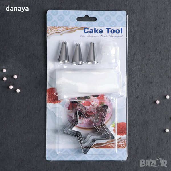 Сладкарски комплект за декорация, който включва 5 броя метални резци с форма на звезда в различни размери, пош с 3 накрайника и съединител. Пошът може да се мие, подходящ за многократна употреба. Чудесен комплект за приготвяне на различни украси от сметана и крем .