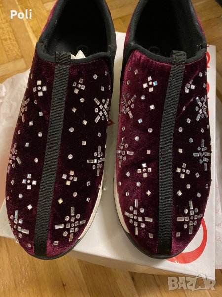Кадифени обувки в цвят бордо. 100% оригинални, купувани са за около 300лв. Отбелязано е, че са нови, защото са обувани точно веднъж и са без абсолютно никакви забележки. Изключително удобни и отговарят на размера си.