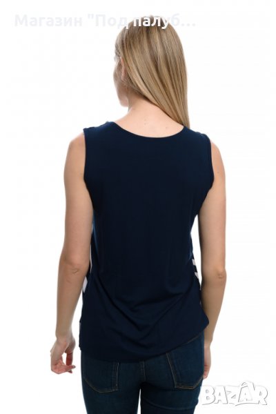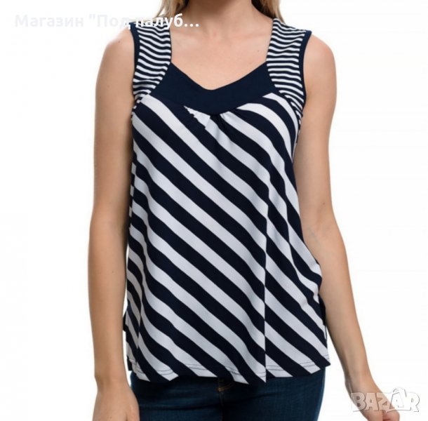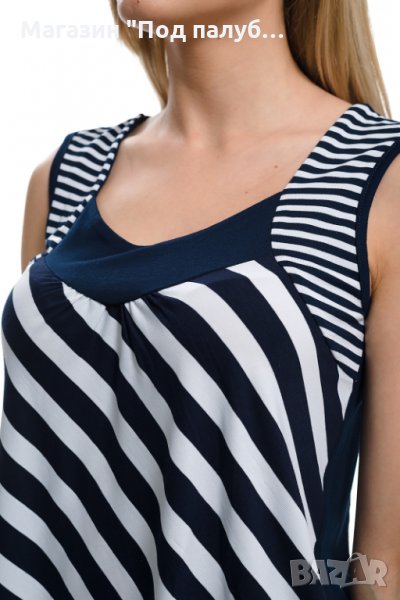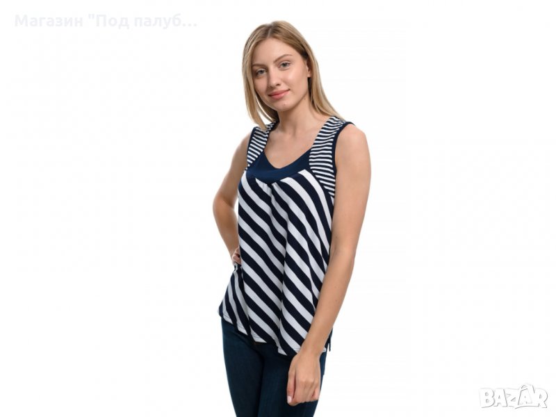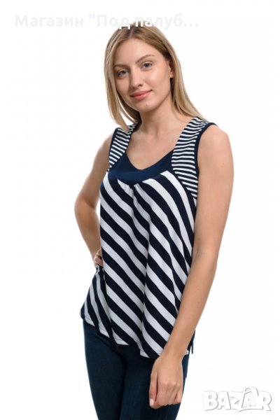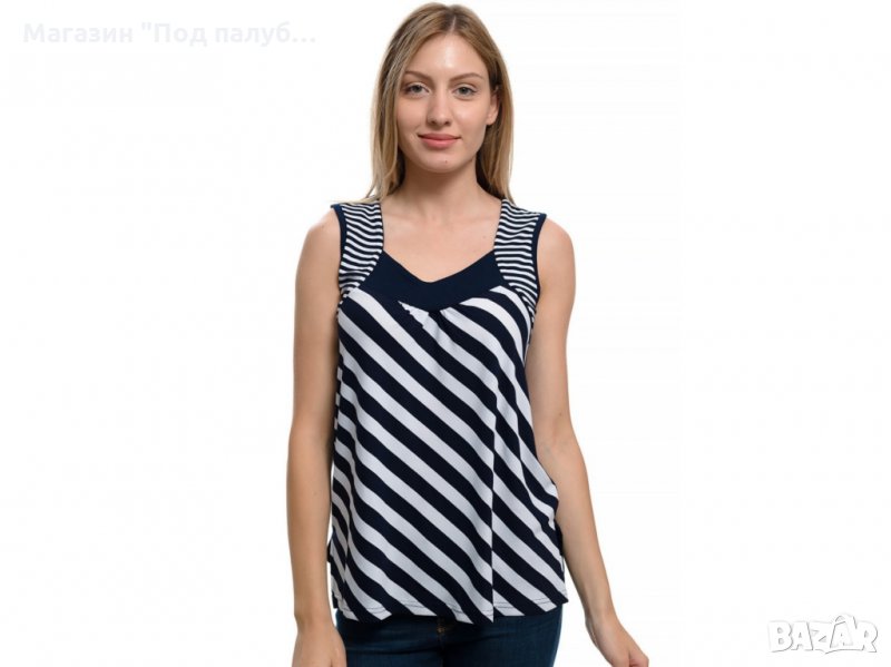Нова елегантна моряшка дамска блуза без ръкави с овално деколте на широки тъмносини райета. Произведена в България под марката PRINTEX , изработена от 90% вискоза и 10% еластан. Подходяща за носене както в горещите летни дни навън, така и вкъщи пред телевизора. Материята на тази блуза е изключително мека и финна при допир, не позволява да се измачка, което я прави изключително ценена и желана от нашите дългогодишни клиенти. Нашите блузи се перат на не повече от 40 градуса в пералня и при пране не подлежат на свиване. Моряшката линия на марката PRINTEX радва своите клиенти повече от 7 години.