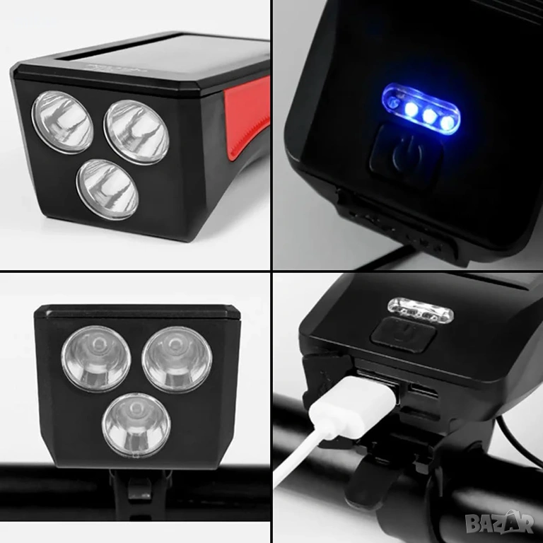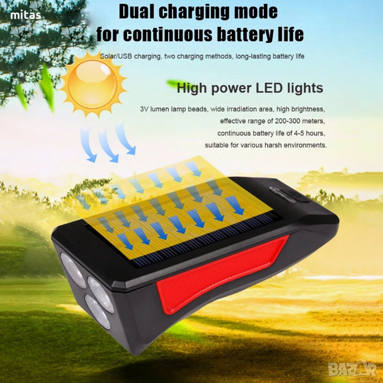 соларна светлина за велосипед, LED фар 350 lum, велосипедна светлина с клаксон, USB акумулаторна светлина, предна светлина велосипед, водоустойчива светлина колело, светлина за електрическа тротинетка, велосипеден фар с аларма, соларно зареждане велосипед, LED фар с 3 режима, аксесоари за велосипед, bike light USB solar horn