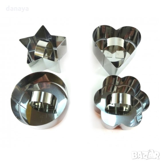 Комплект от 4 броя рингове за оформяне на храна с форма на сърце, цвете, кръг и звезда. Ринговете имат бутало и са идеални за оформяне и декориране на различни десерти, ястия, салати, ориз, гарнитури. Може да се използват за индивидуални порции както и за оформянето на кули с различни слоеве. Готварски комплект, който е практичен и нужен за всяка кухня.