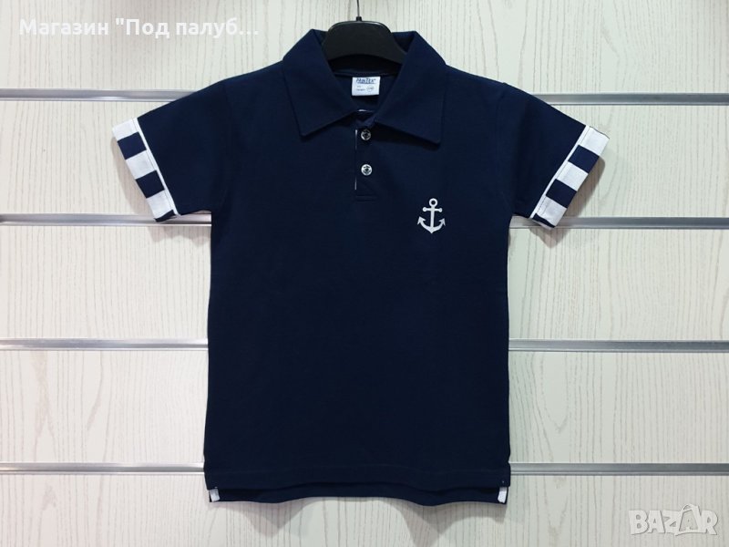 Страхотна нова детска моряшка блуза тип Lacoste с къс ръкав в тъмносин цвят, малка щампа котвичка, яка и лазерно гравирани копченца. Произведена в България под марката PRINTEX от 100% висококачествен памучен плат, тип пике, което не позволява да се измачка. Може да се пере до 40 градуса в пералня, а материята не позволява да избелее.