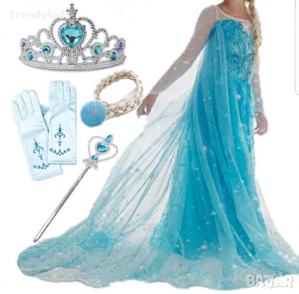 Нова, изключително красива приказно- ефирна парти рокля на принцеса Елза от Замръзналото кралство. На гърдите има красива ледена снежинка. Ръкавите са от еластична мрежеста материя със сребристи орнаменти - края е с изящен завършек от цвете, което се закача на пръсчето. Роклята е изработена от син сатен, покрит отгоре с пласт тюл, обсипан с красиви блестящи орнаменти. Гърбът е еластично памучно трико. Дължината на роклята е до глезена. Шлейфът е дълъг, влачещ се по земята, напръскан с бляскави малки снеженки.