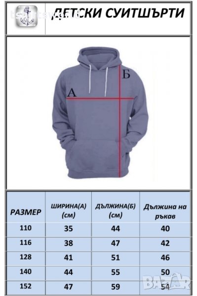 Таблица с размери в см е прикачена към снимките на продукта!!!