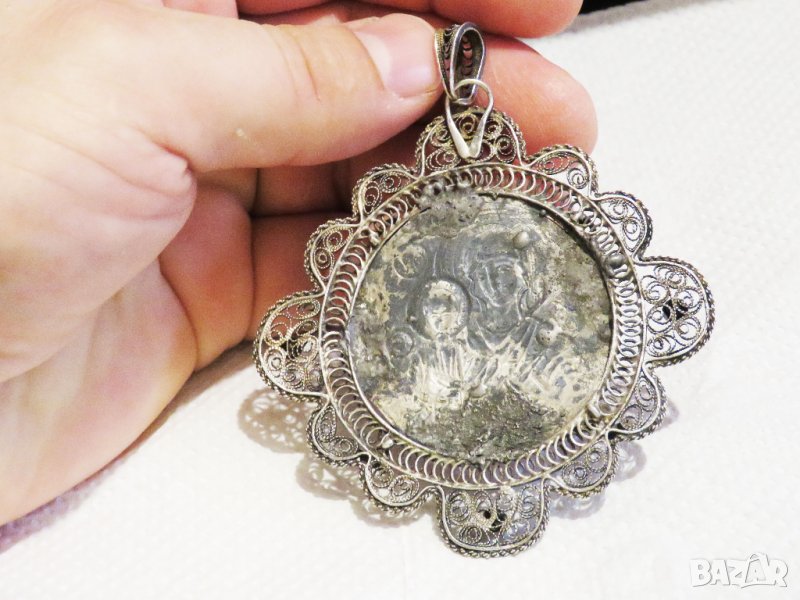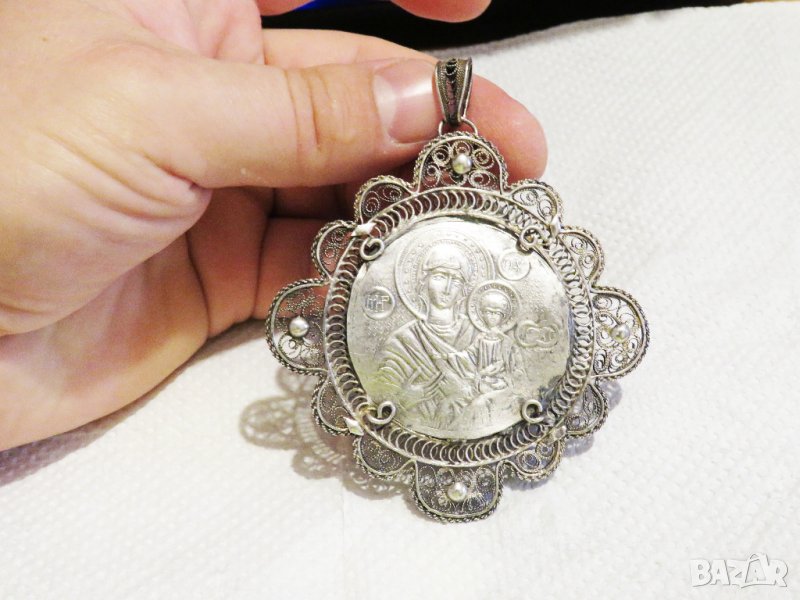 Възрожденска Сребърна икона, амулет, накит, медальон с Богородица, Дева Мария - Панагия 70 мм - Богородица с младенеца с филигран и сребърен синджир - за да ви пази и закриля .