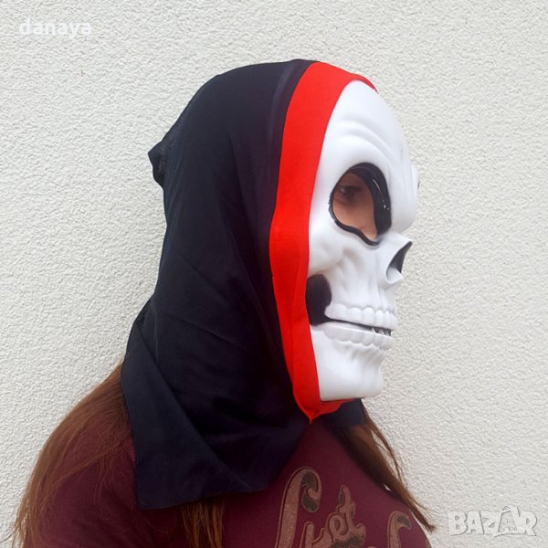 Страшна маска за Хелоуин череп с качулка. Маската е пластмасова с качулка от плат. Парти маска, идеална за Хелоуин партита, театрални и сценични костюми, училищни партита.