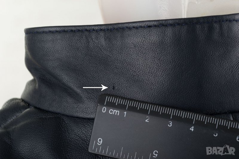 Забележка - има леко зацапване на кожата отпред долу. Тук-там има малки сребристи точици от маркирането на кожата при кроенето.