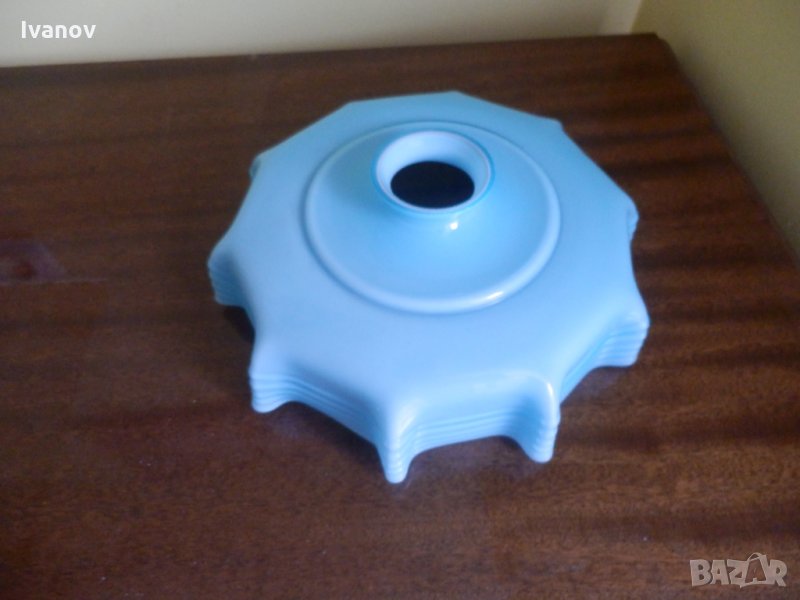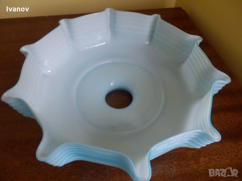Накъдрено светло синьо кристално стъкло за лампа, абажур от 20- 30те години на миналия век. Диаметър 25 см, отвор 4 см.