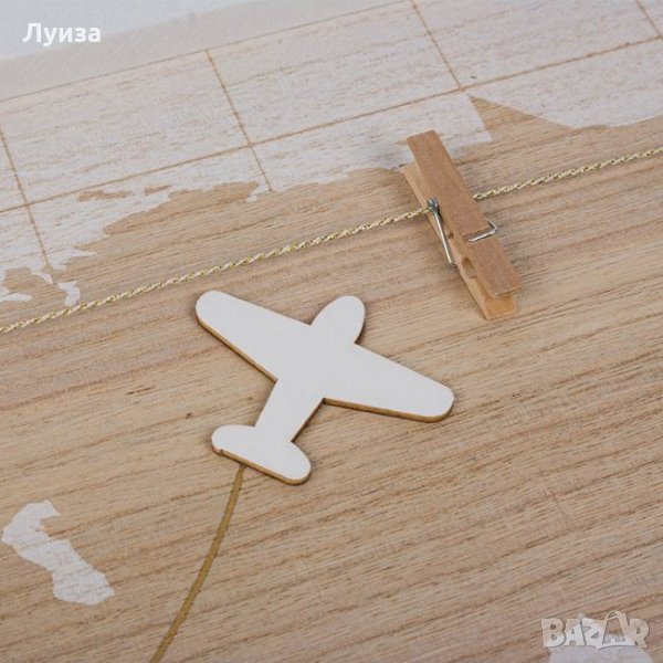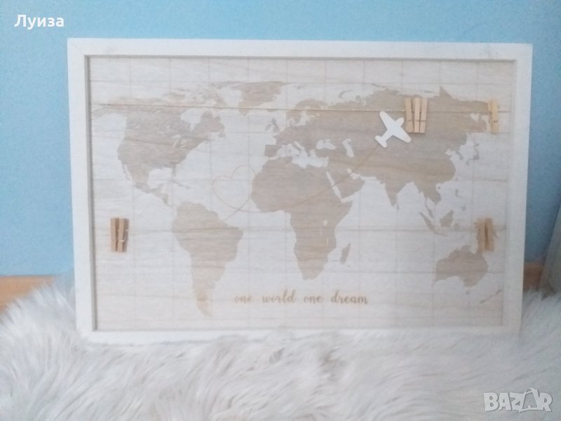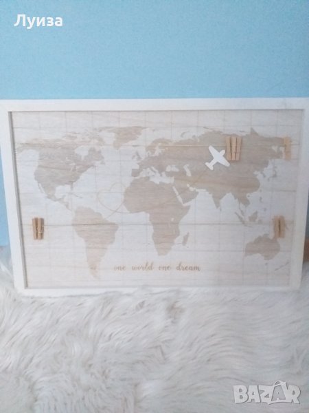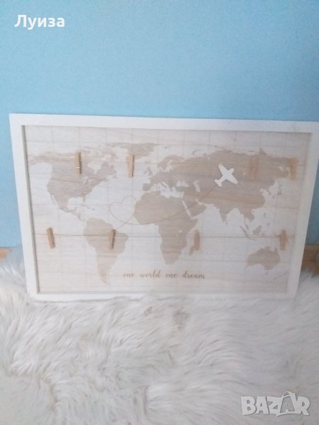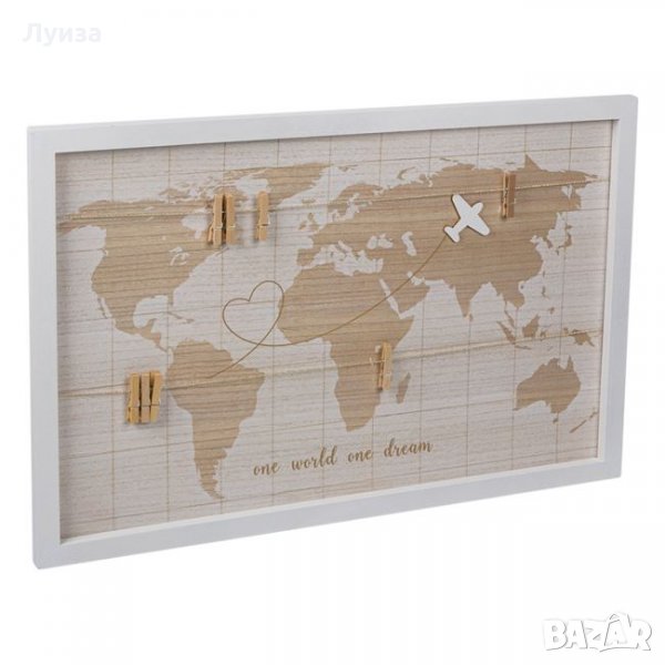 Красиво дървено пано с елемент "континенти" и малки щипчици, на които да закачите снимките от Вашите пътешествия!