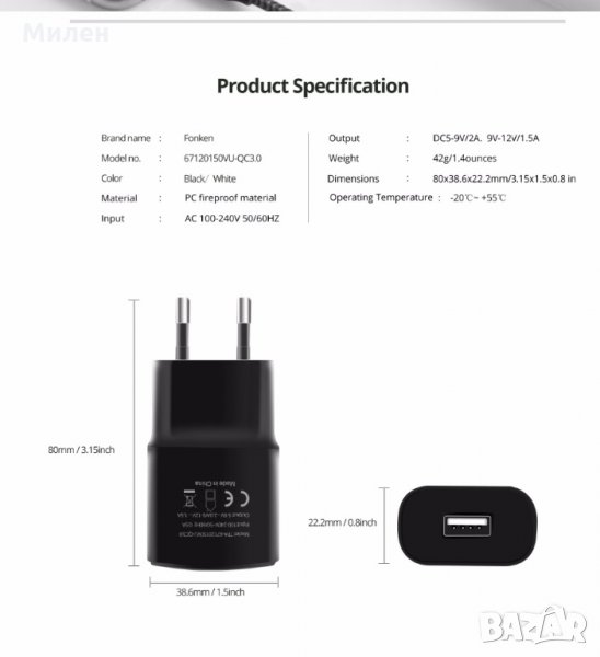 1. FONKEN 18W USB зарядно Бързо зареждане 3.0 - черно - 8лв.