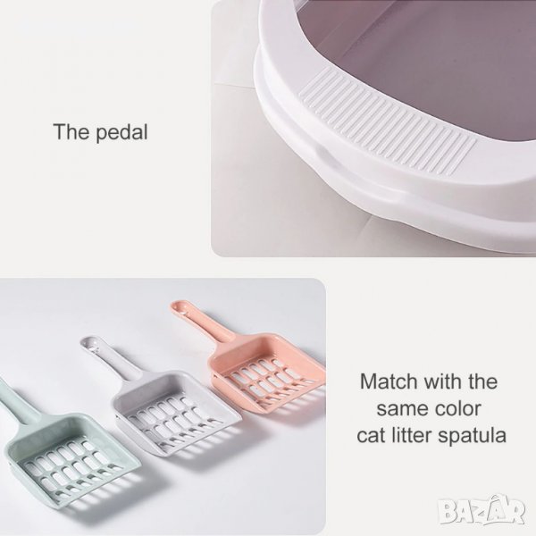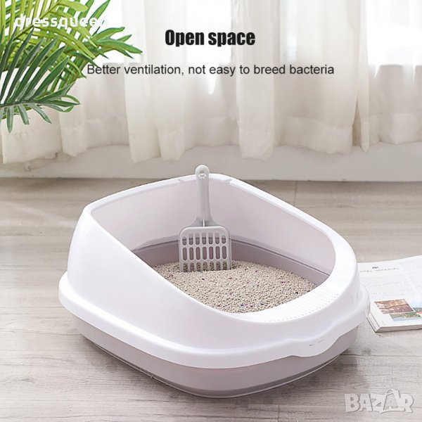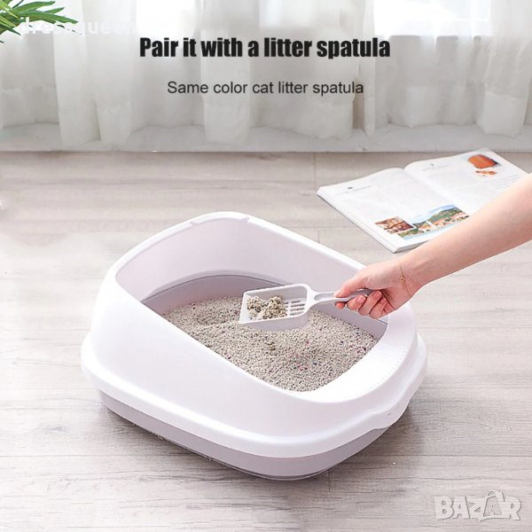 Котешка тоалетна с борд и модерен дизайн. Високия борд задържа поселката и урината вътре в тоалетната. Нисък вход за лесен достъп. Заедно с котешката тоалетна получавате и лопатка/сито, която се закрепва за самия леген