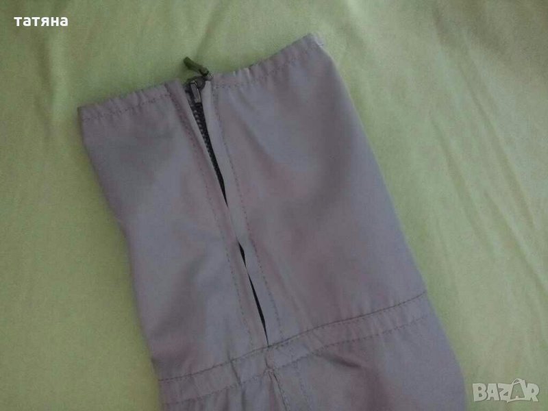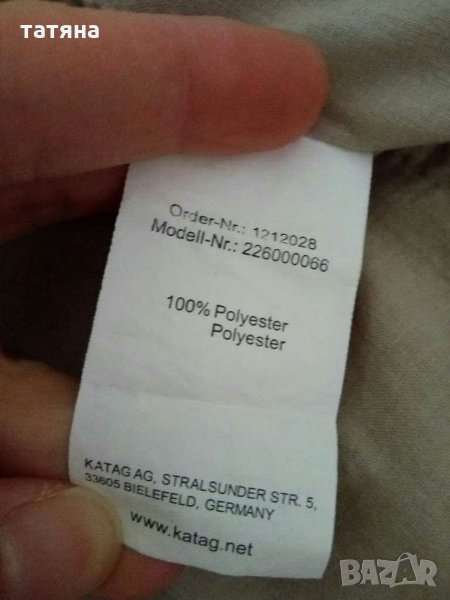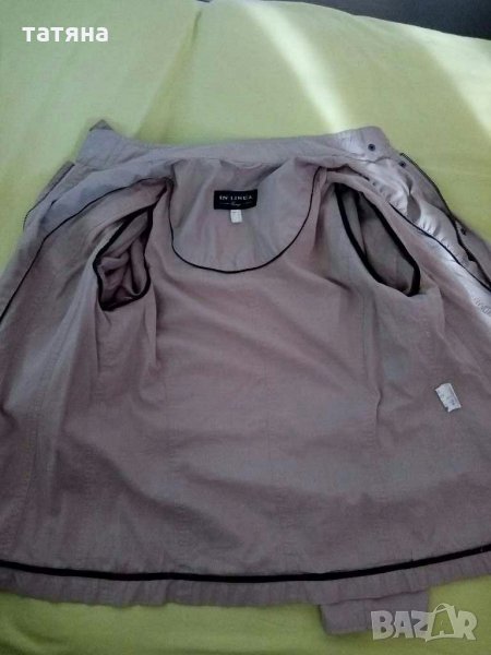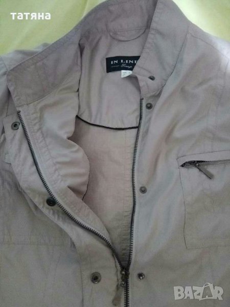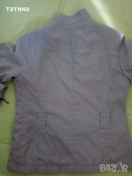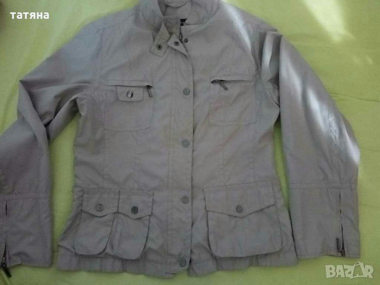 Бежово тънко якенце.Материята е като шушляк.Размер по етикет 40.Има доста джобчета,цип и копчета.Размери: от рамо до рамо 42см,дължина 62см,ширина между подмишници 50см,дължина ръкав дълга страна 61см къса 48см.Без следи от употреба.