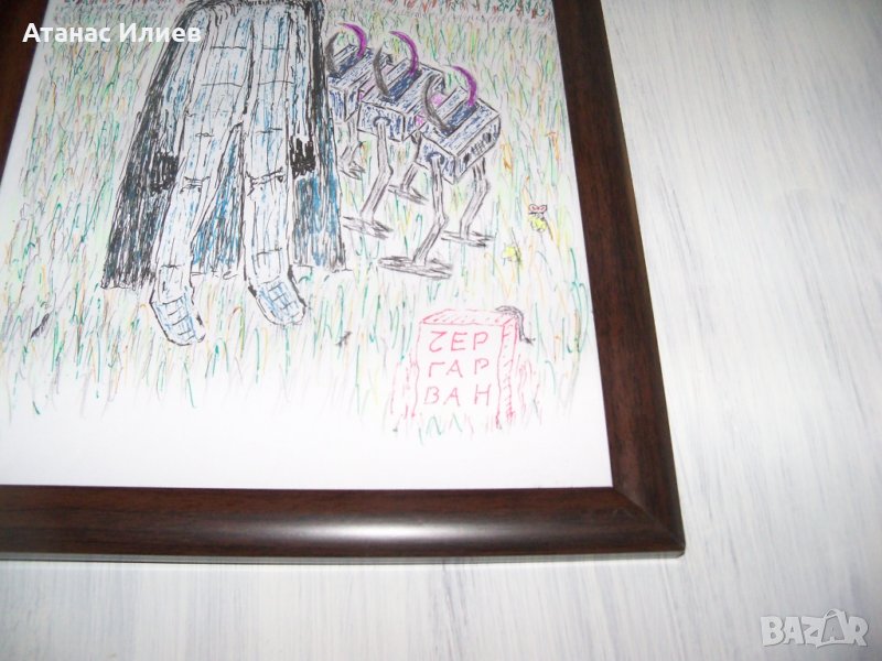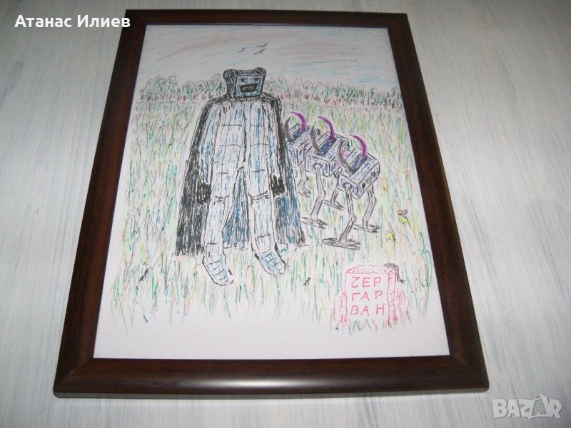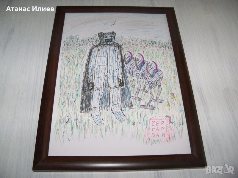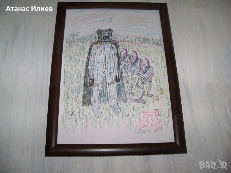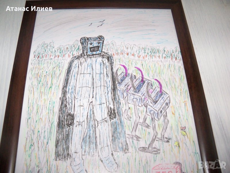 Оригинална рамкирана илюстрация към разказа "Пандемия 2222". Илюстрацията е изпълнена с тънкописци на формат А4 и рамкирана в рамка с размери 24х32 см. Заедно с картината получавате и разказа принтиран заедно с двете илюстрации към него. Автор на илюстрациите и на разказа е Атанас Илиев с псевдоним Чер Гарван. Повече от неговите разкази можете да прочетете на сайта му "Гарванови истории".