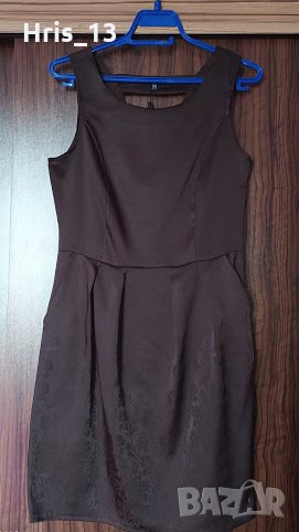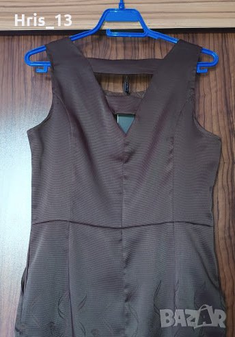 Кафява рокля размер между С и М, леко сатенирана, много приятна материя, дължина над коляното, с набор на талията, страничен цип и странични джобове, интересен гръб, красива щампа в долната част, видима под определен ъгъл, роклята е подходяща за офис или повод.