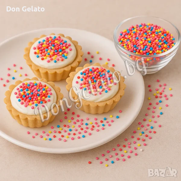 С захарните и шоколадовите декорации на Don Gelato щe придадете един цветен и модерен завършек на всяко сладко изкушение и десерт. Освен със своя външен вид и свежи цветове малките топчета и пръчици ни привличат и със своя уникален вкус. Подходящи за украса на сладоледи, гофрети, понички, плодови коктейли, торти, мъфини и много други лакомства и сладки.