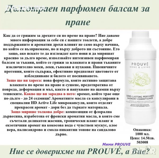 Парфюмиращ балсам за дрехи Концентрат е - 1литър = 4 литра Обем 1000 мл. 18.90 лв. Аромата се усеща до 8 седмици!