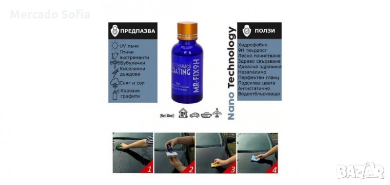 Керамичното покритие e супер хидрофобно покритие от течно стъкло и действа като запечатващ слой върху лака на колата. Осигурява изключително здрава защита с твърдост 9Н, която предпазва от драскотини и осигурява допълнителен блясък. С това покритие предпазвате автомобила си от стареене, избледняване на цвета, киселинни дъждове, слънчева светлина, екстременти на птици, индустриален прах и др.