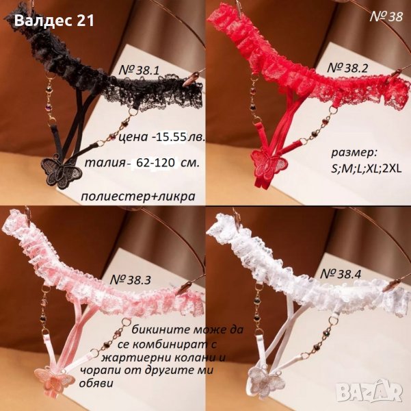 - На всяка снимка са показани възмозните цветове на модела, написан е номера на модела и възможните размери - минималното и максималното разтягане. Хубаво е да има 2-4 см. толеранс между персоналните мерки и максималното разтягане на всеки от моделите, моля обърнете им внимание, защото бельто не може да бъде върнато или заменено ако е напуснало куриерския офис поради обясними хигиенни и здравни причини;