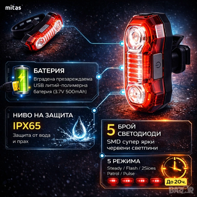 - Режими на работа: 5 режима – Steady / Flash / 2Sides / Patrol / Pulse