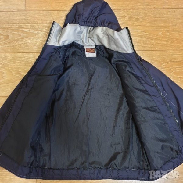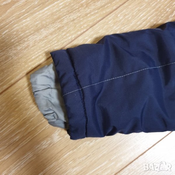 Детско яке за момче на около 7-8 г. Цветът е тъмносиньо със светлоотразителни сиви ленти. Подходящо за есенно време или по-топла зима. На ръкавите има втори вътрешен плат с ластик, за да не влиза студ или вода. Качулката също е с ластик против вятър и студ. Има и допълнителен джоб на ръкава. Много удобно и напълно здраво.