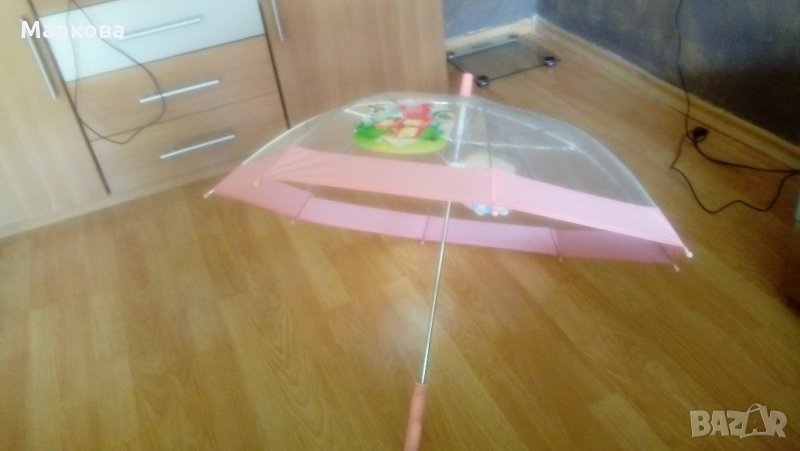 Чадърче за момиченце. Автоматично отваряне. Прозрачно с 2 картинки. Ново, неизползвано. Стояло е в хартия. Дължина с дръжката 66 см.