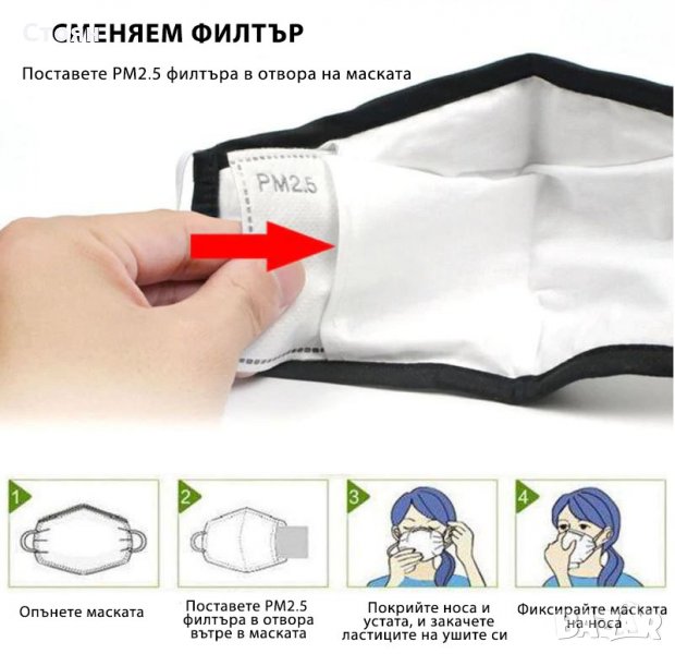 Уверете се, че вашите ръце са чисти и след това извадете маската от опаковката. Сложете сменяем филтър в джобчето, разположено от вътрешната страна на маската. Поставете маската върху лицето. Регулирайте еластичните шнурове зад ушите. Наместете маската под брадичката. Оформете клипса по формата на носа с пръсти.