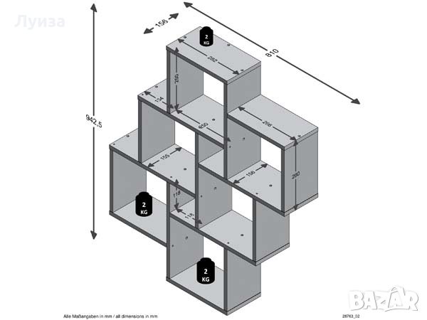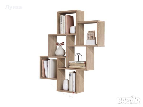 Практична и изключително красива етажерка походяща за съхранение на вещи. Универсално използваема, например като CD рафт или като рафт за декорация във всяка стая. Състои се от 6 големи и 2 малки рафта. Повърхност от меламиново покритие, устойчиво на надраскване.
