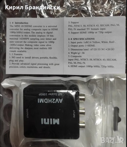 С този преходник може да свържете устройства с RCA AV ( чинчове ) стари конзоли ,ДВД- та видеоплейъри към телевизори монитори с HDMI ,на снимката съм свързал старо ДВД с нов монитор с HDMI.Преобразува аналогов композитен вход в изход HDMI 1080p (60HZ), показан на 1080p (60HZ) HDTV / MoniterПоддържа HDMI 1080p или 720p изход.Поддържа PAL, NTSC3.58, NTSC4.43, SECAM, PAL / M, PAL / N стандартни телевизионни формати вход.Внимание: Моля, използвайте захранващия кабел включен в комплекта, за да работи този видео конвертор перфектно. Използвайте технически изрядни захранващи адаптери!!!Преобразува RCA (AV, композитни, CVBS) сигнали в HDMI сигнали, така че можете да гледате видеото си на модерен телевизор с HDMI портове.1. Входни портове: 1xRCA (жълто, бяло, червено), USB захранване2. Изходни портове: 1xHDMI (стандарт)3. NTSC / PAL съвместим4. Композитен вход: PAL, NTSC3.58, NTSC4.43, SECAM, PAL / M, PAL / N5. HDMI изход: 1080p / 60Hz, 720p / 60Hz6. Размери (мм): 66 (D) x55 (W) x20 (H)7. Тегло (g): 40гр8. Захранване: USB порт