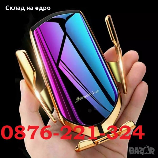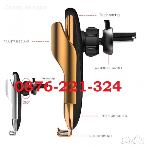 Луксозна автоматична захващаща стойка за телефон в кола с безжично Wireless зарядно устройство в нея. Модерна стойка, предназначена за хора, които ценят дизайна, практичността и новите решения. Висококачествена автомобилна стойка предназначена за монтиране в вентилационната решетка на парното на вашата кола. Стойката използва съвременна технология, състояща се от автоматично затягане на страничните ламели прихващащи телефона, което прави стойката изключително функционална и стабилна като захват. Максималната широчина на раздалечените прихващащи ламели е 95 мм. В долната част която поддържа нашето устройство, има вход предназначен за USB кабел тип micro. С този кабел (Включен в комплекта – USB2.0-USB micro) се свързва стойката към захранване, към адаптер-зарядно включено към запалката на автомобила, кабела е дълъг 1 м. Благодарение на вградените сензори в горната част на дръжката, страничните рамена на дръжката се отварят и затварят автоматично. Това е много практично решение, всичко, което трябва да направите, е да приближите телефона си до стойката и страничните прихващащи ламели автоматично ще се разширят, за да освободите телефона от стойката, докоснете задна част на стойката-зад сензора, така стойката ще се отвори и ще може да си освободите телефона. Стойката работи само когато е включена постоянно към зарядно в запалката на автомобила (Зарядното-адаптера не е включено в комплекта)