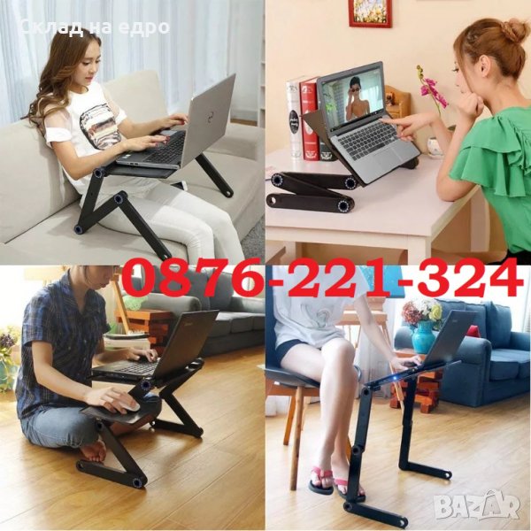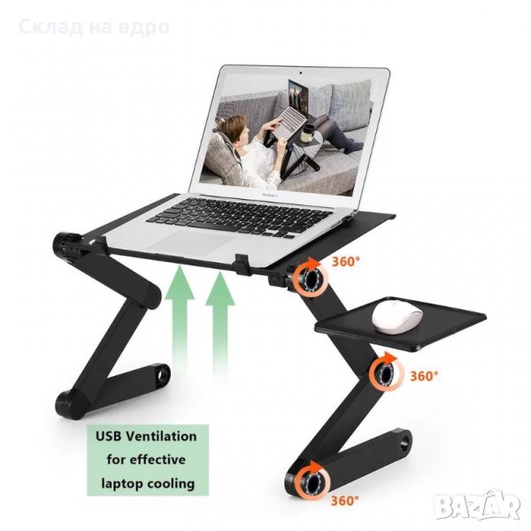 Лаптоп масата с охладители за легло от алуминий има крака, въртящи се на цели 360 градуса. Масата е компактна, лека и мултифункционална. Краката, които самостоятелно се завъртат на 360 градуса я правят наистина удачна за всяка заета поза на тялото, както и за поставяне навсякъде, където ще използвате компютъра си и едновременно тя е здрава и стабилно стои към повърхността, върху която е позиционирана. Продуктът разполага с 2 на брой вентилатора за охлаждане, които са изключително безшумни. Зареждат се чрез USB портовете на лаптопа и предпазват лаптопа от прекомерно нагряване. Устройството може да се ползва за преносими компютри с всякакъв размер. Комплектът съдържа и подложка за мишка, направена от алуминий, чийто монтаж е лесен, а ъгълът на поставяне е регулируем. Масичката за лаптоп е най-вече удачна за употреба в леглото, докато се храните, а с нейна помощ може да четете и книга. Тази подложка за лаптоп с крачета е удачна и за бременните дами, защото ще им осигури необходимия комфорт при ползване.