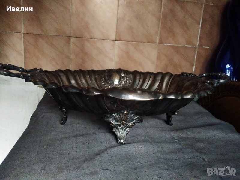 посребрена барокова купа,фруктиера от месингс монограми на медальоните.висока е 10см,дълга 42см,само купата е 6см/32см/25см.внос от франция.