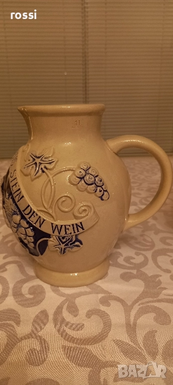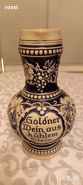1. Надпис "Goldner Wein aus kühlem Stein"(Златно вино от керамична кана) - богата релефна орнаментика от гроздове и лозови листа от всички страни - 1 л. - 45 лв./20 евро.