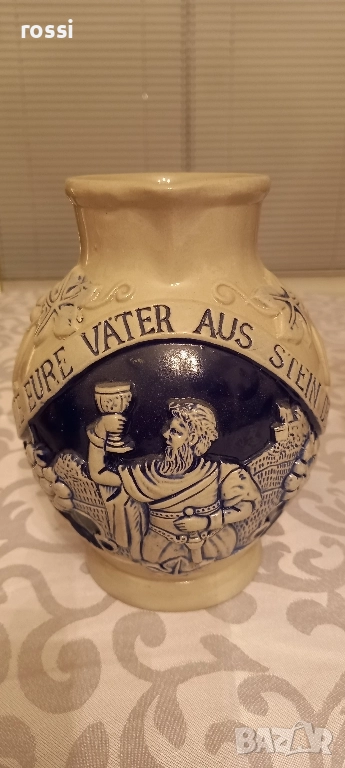 2. Надпис "Trinkt wie eure Väter aus Stein den Wein"(Пийте вино от керамика като вашите бащи) - с релефно изображение на Дионис - Бога на виното с чаша вино в ръка, с гроздове и лозови листа - 1 л. - 40 лв./20 евро.