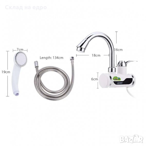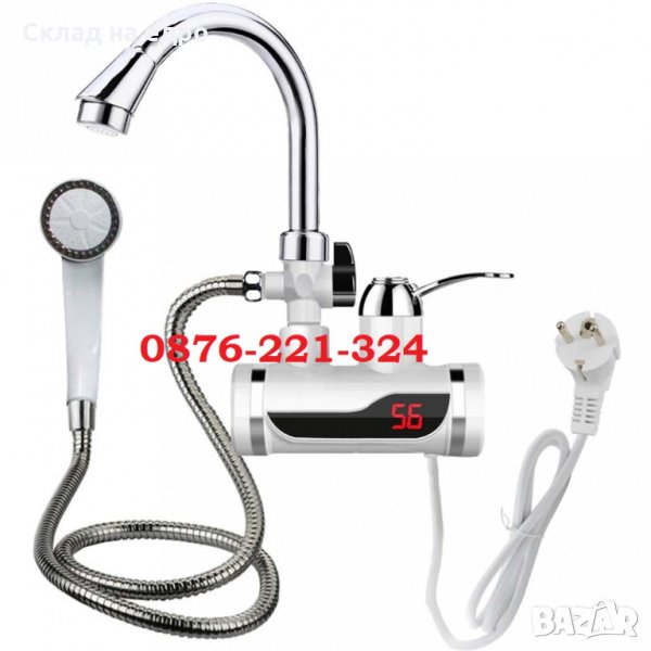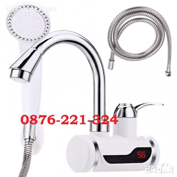 Смесителна батерия с вграден проточен бойлер за хоризонтален (стеннен) монтаж и подвижен душ. Мощен 3000W нагревател за стена.