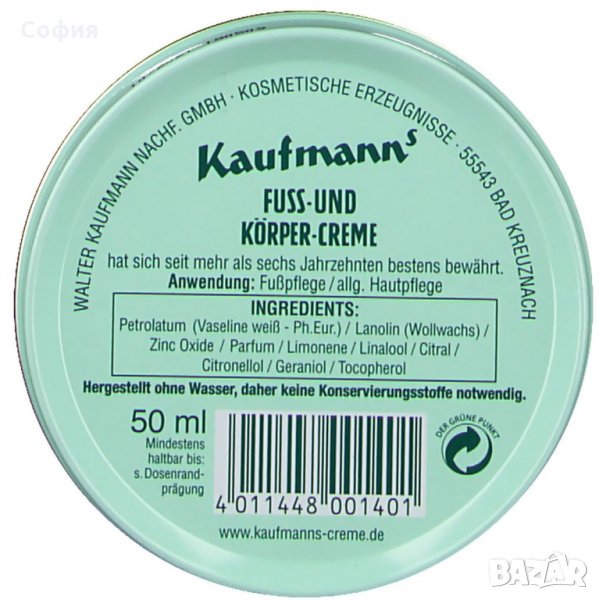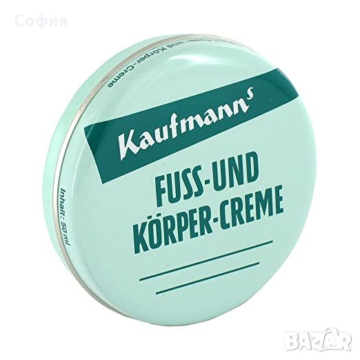 Изключително ефикасен крем за крака и тяло 50мл Kaufmanns Fuß- und Körpercreme 50ml без консерванти. Краката ни се нуждаят от особено внимателна грижа, тъй като ден след ден, година след година, те са изложени на силно натоварване. Кремът за крака и тяло на Kaufmann е висококачествен, пълномаслен продукт за лечение на груби и напукани ръце или други сухи кожни участъци, като осигурява надеждна и полезна грижа за краката ви. Произведен от Walter Kaufmann Nachf. GmbH. Доставен от Германия и е с дълъг срок на годност.