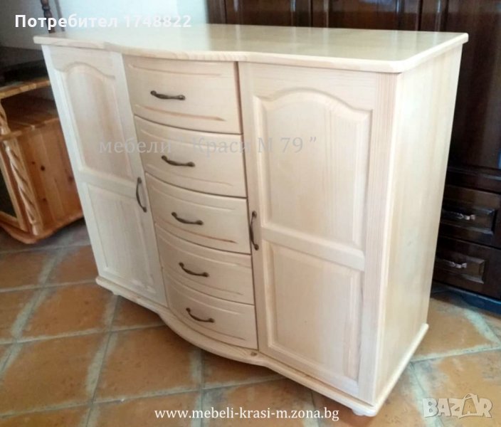 Изработен от масивна дървесина в натурален цвят. Размери 122/100/48 см. Чекмеджета с телескопични водачи и панти с плавно затваряне на вратите. Възможност за изработка и по размер на клиента. Наличен!