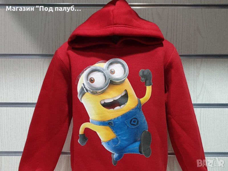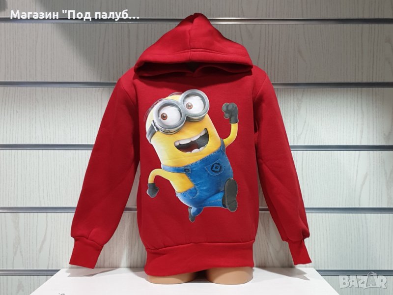 Страхотен нов детски суичър в червен цвят с качулка и трансферен печат Миньони. Произведен в България под марката PRINTEX от 100% висококачествен памук, което го прави изключително топъл и желан от нашите дългогодишни клиенти. Моделът е подходящ за пролетния и есенно-зимният сезон, има ластични маншети на китките и ханша, запазващи топлината. Меката подплата и свободната кройка го прави изключително удобен за нашите малки клиенти.
