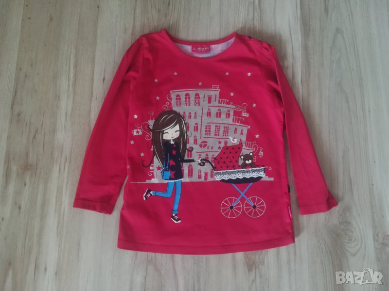 3. Блузка в червено LC Waikiki (снимка 5) - размер по етикет - 4-5/104-110 см, състав - изрязан е етикета, но предполагам е памук, материята е качествена. Отпред има сладка щампа и дантелена апликация. Гърба е на звездички. В отлично състояние без забележки. дължина - 43 см, ширина -31 см, ръкав -35 см