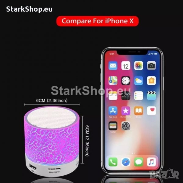 Мини портативна LED тонколонка в различни цветове с лед светлина, удобна за пренасяне поради малките си размери. Снабдена с Bluetooth, MicroSD, USB, AUX и Радио.