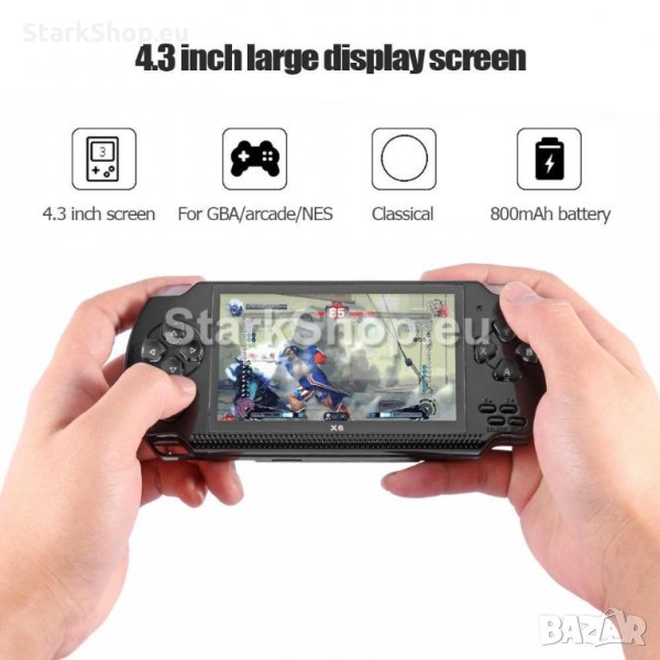 Преносима игра (конзола) X6 е с изключително високо качество и голям дисплей – има хиляди вградение игри! Класики като SONIC, SUPER MARIO, MORTAL COMBAT, TANK, CONTRA, METAL SLUG, STREET FIGHTER и много други, като могат да се инсталирват и още.