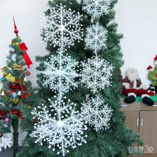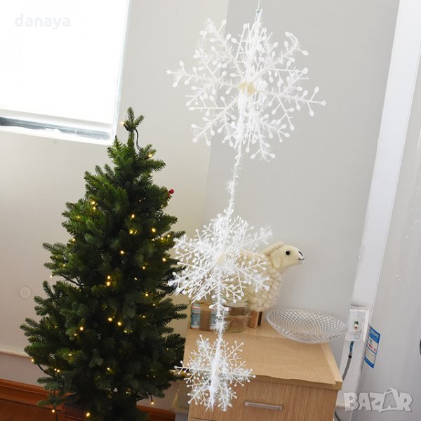 Комплект 3D снежинки за коледна украса. Подходящи са за окачване. Комплектът включва 2 големи снежинки с диаметър 25.5см, 2 средни снежинки с диаметър 16см, 2 малки снежинки с диаметър 12см и въженца за тяхното свързване и закачане. Изработени от пластмаса и лъскав гирлянд. Двойките снежинки са изработени така, че да се свързват една с друга, за да образуват 3D виждане. Създават ефектна коледна и новогодишна украса, където и да се закачат.
