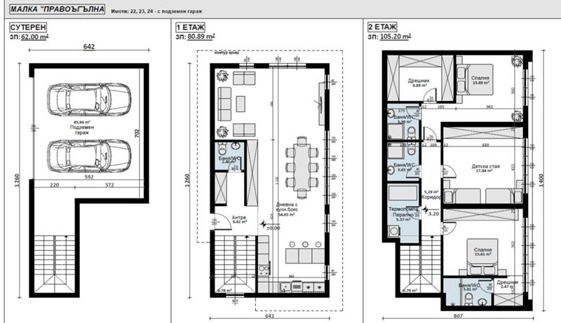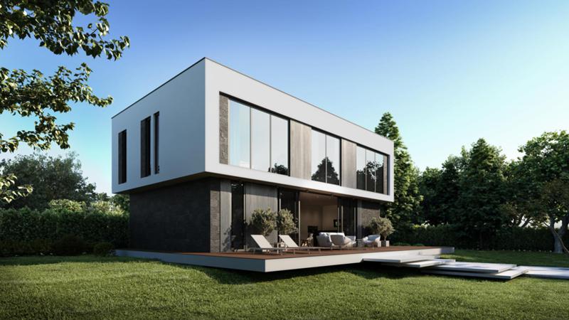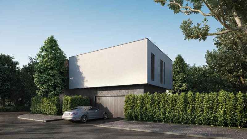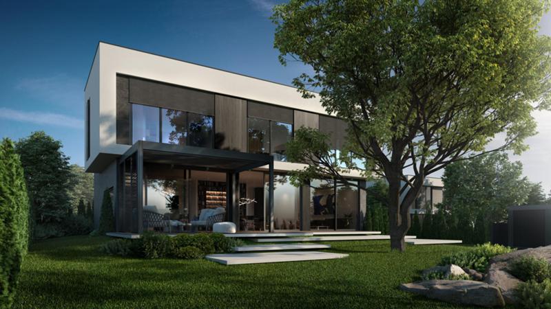 Къщите са построени в модерен стил, с ексклузивни интериорни и екстериорни решения. Стандартната еднофамилна жилищна сграда е на два етажа. Алея води до входа на сградата. Пространството е отворено към голяма веранда и към двора на сградата. По външната фасада е използвана мазилка в бял цвят, HPL в сив цвят и сив камък по целия първи етаж.