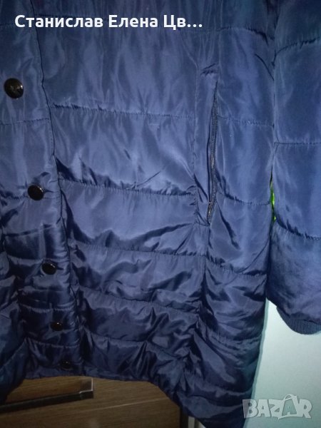 Дамска зимна шуба, тъмносиня, отпред се закопчава с цип и тик так копчета, качулката се сваля, на цип е, джобовете също са с ципове, размер по етикет ХХЛ. Няма забележки.