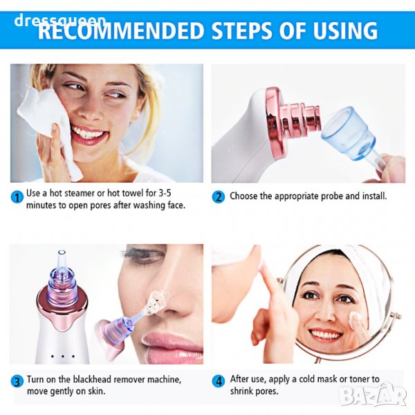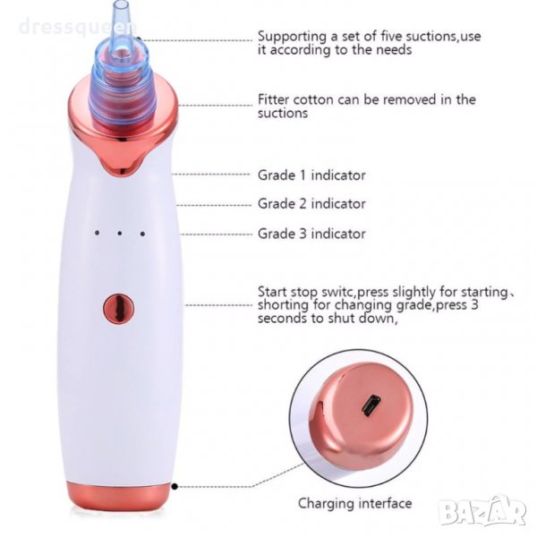 Уреда има функции на изглаждане и овлажняване на кожата, отстраняване на акне, почистване на порите и изсмукване на комедони. Той е акумулаторен, лесен и удобен за употреба. Предлага се с 5 накрайника, които предлагат различни функции за по-дълбоко почистване кожата на лицето ви. Помага да премахнете порите, черни точки, бръчки на лицето си и да поддържате кожата чиста.