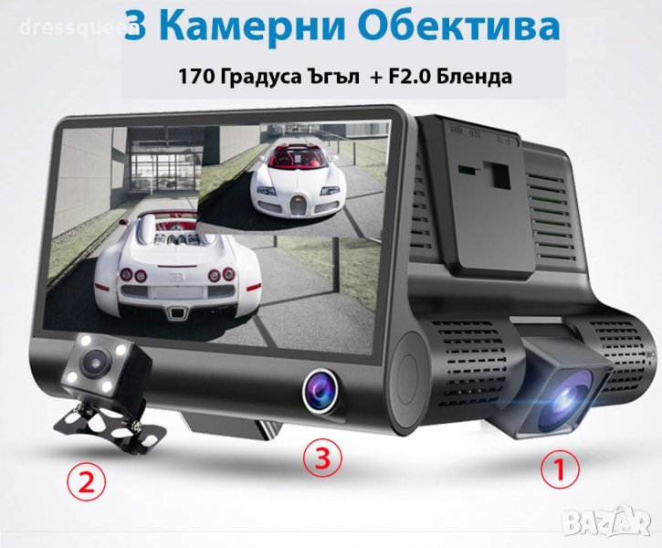 2627 Видеорегистратор Full HD 1080P с 3 камери и 4 инчов дисплей