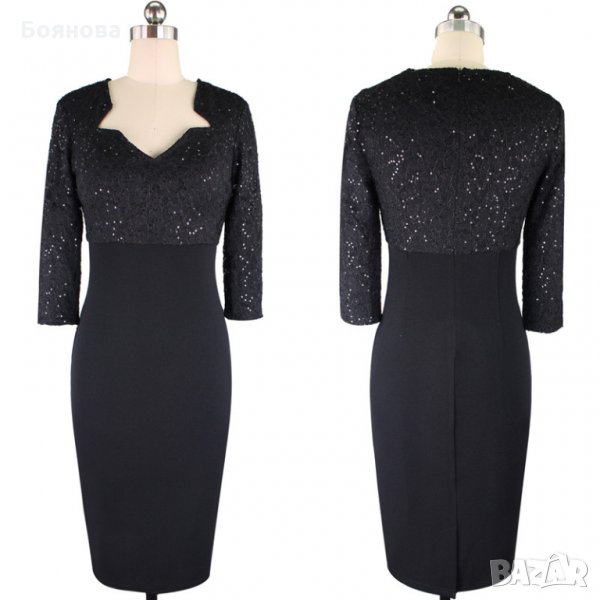 Елегантна Секси рокля с паети и подплата.Талия до 100 см,бюстк до 110 см,ханш до 115 см.В ханша е еластична.Дължина 96 смПолиестер и спандекс.
