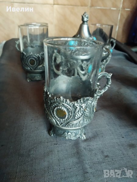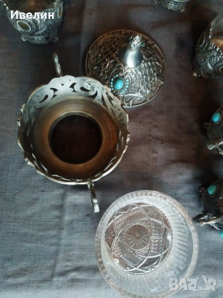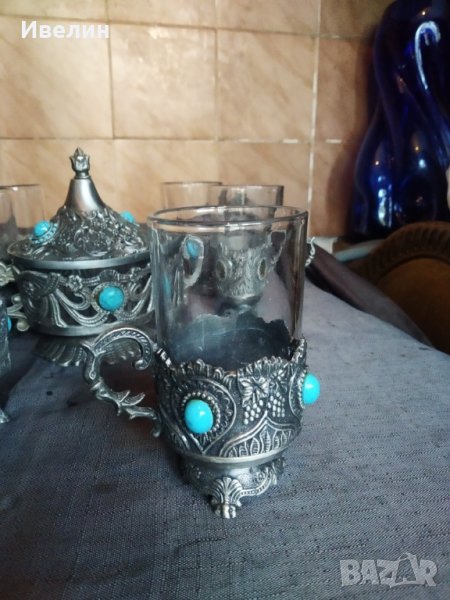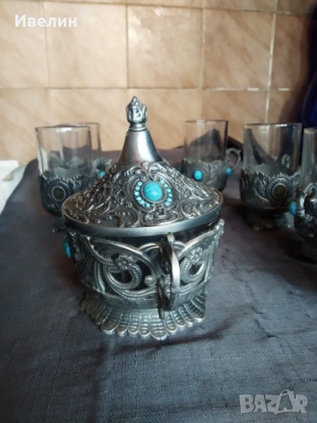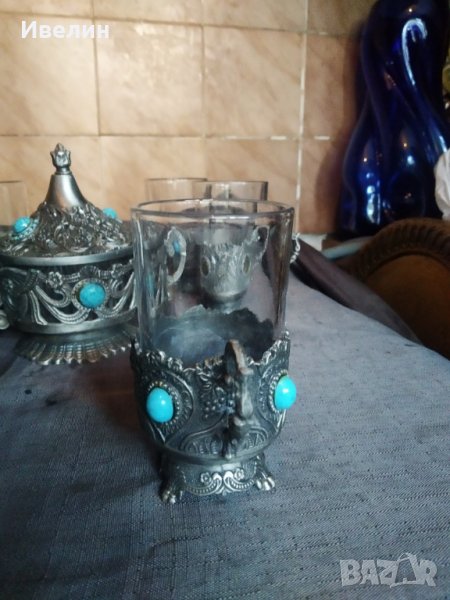 захарница с шест чаши.стъкло с метален обков.захарницата е 13см,диаметър 10см.чашите са високи 11см,диаметър 5,5см.на две чаши липсват сините камъчета за декорация.