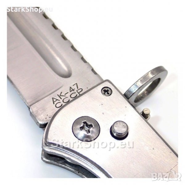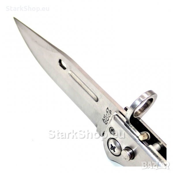 Стомана 440 C, ножът е снабден с подпрожинен механизъм за лесно отваряне с една ръка, също така има блокировка при нежелено отваряне или затваряне на острието. Ръкохватката е от дървени чирени. Щампата на острието от AK-47 СССР е с набивка. Калъфа е камуфлажен водоустойчив, с ухо за закачане на колана.